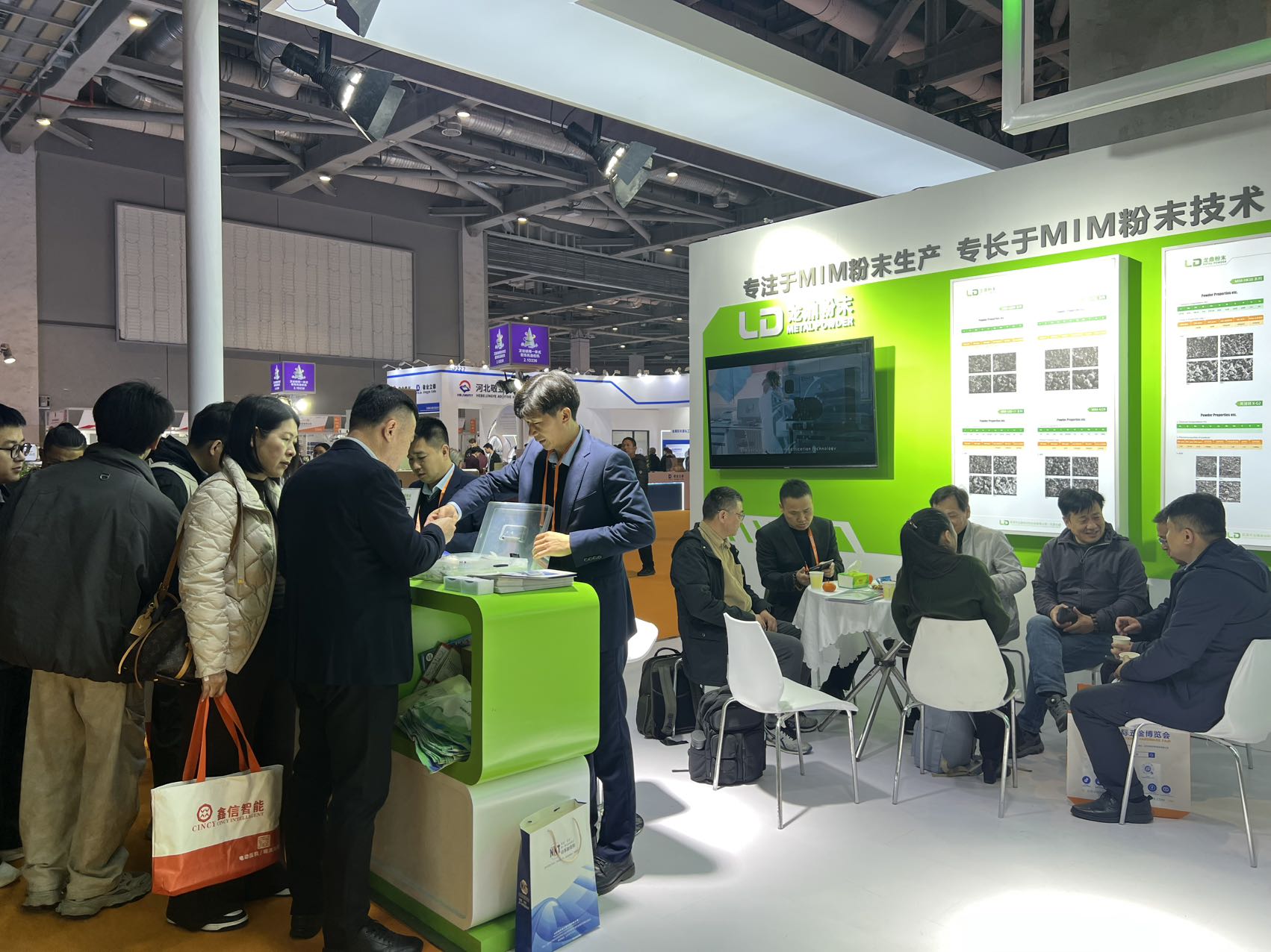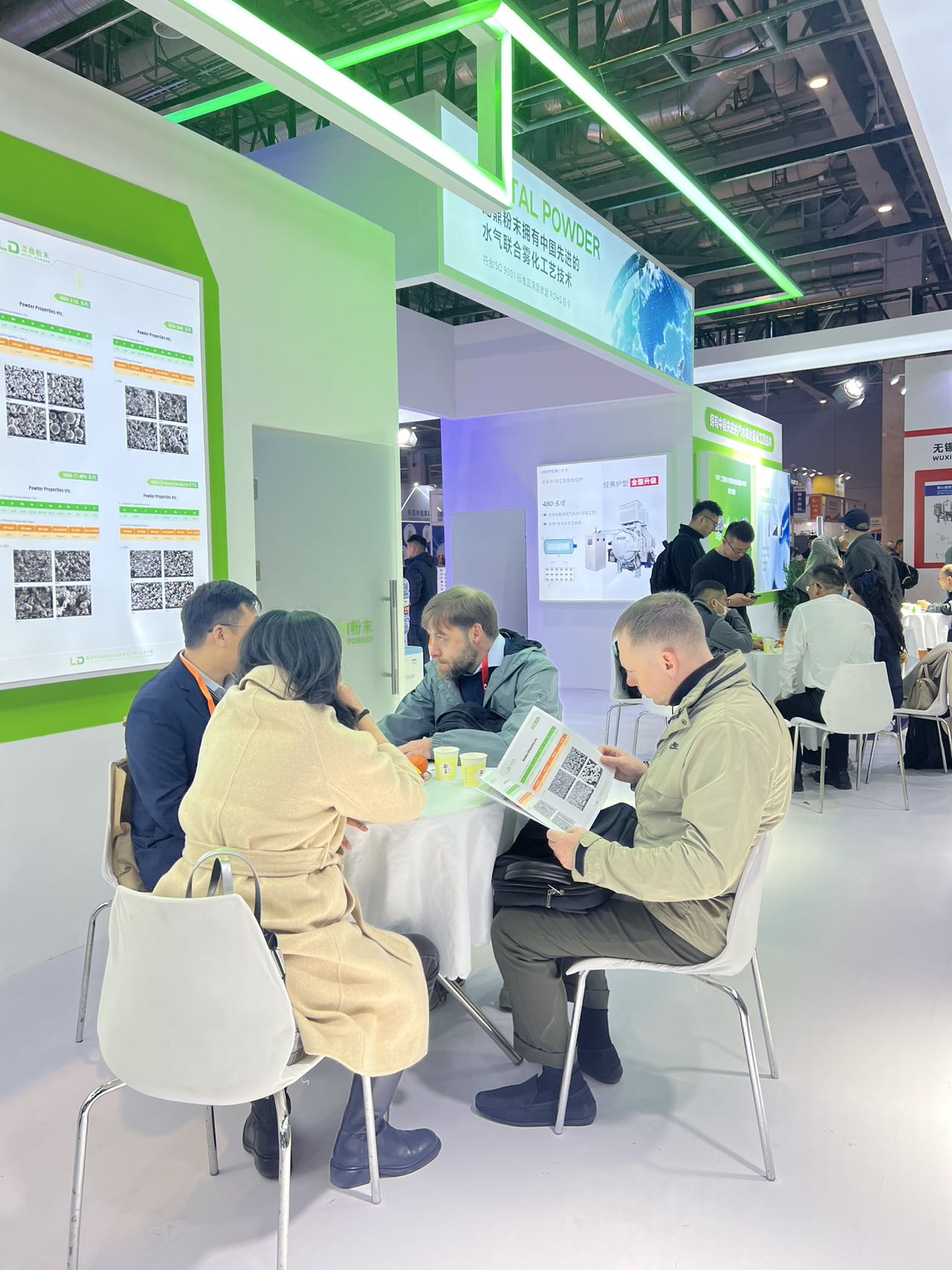 展位內(nèi)設(shè)置了多輪商務(wù)洽談環(huán)節(jié),客戶與技術(shù)團(tuán)隊(duì)圍坐交流,圍繞 MIM 粉末的選型、工藝優(yōu)化、量產(chǎn)適配等核心問題展開深入探討,現(xiàn)場(chǎng)合作意向滿滿。