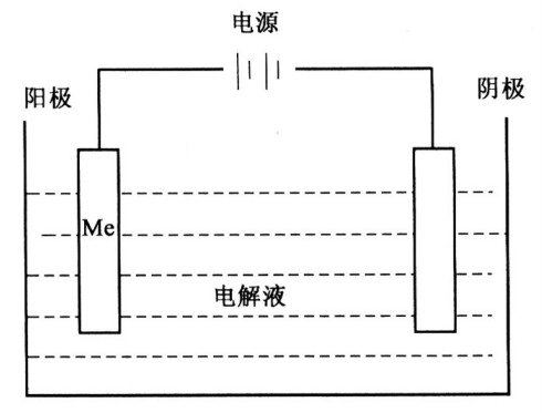 電鍍?cè)恚涸诤杏兘饘俚柠}類(lèi)溶液中,以被鍍基體金屬為陰極,通過(guò)電解作用,使鍍液中欲鍍金屬的陽(yáng)離子在基體金屬表面沉積,形成鍍層。如下圖所示。
