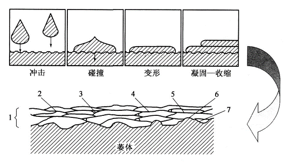 采用各種熱源使涂層材料加熱熔化或半熔化,然后用高速氣體使涂層材料分散細(xì)化并高速撞擊到基體表面,從而形成涂層的工藝過(guò)程,如下圖所示。